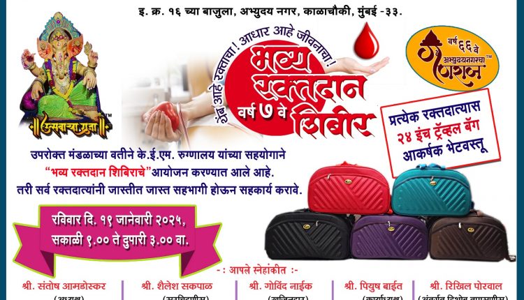 मुंबई (गुरुदत्त वाकदेकर) : अभ्युदयनगर येथील बालगोपाल सार्वजनिक गणेश उत्सव मंडळाने केईएम हॉस्पिटलच्या सहकार्याने रक्तदान शिबिराचे आयोजन केले आहे, जे रविवार, १९ जानेवारी २०२५ रोजी सकाळी ९:०० ते दुपारी ३:०० वाजेपर्यंत गणराज सभागृह, इमारत क्र.१६ च्या बाजूला, अभ्युदय नगर, काळाचौकी, मुंबई-४०००३३, येथे आयोजित केले जाईल.
