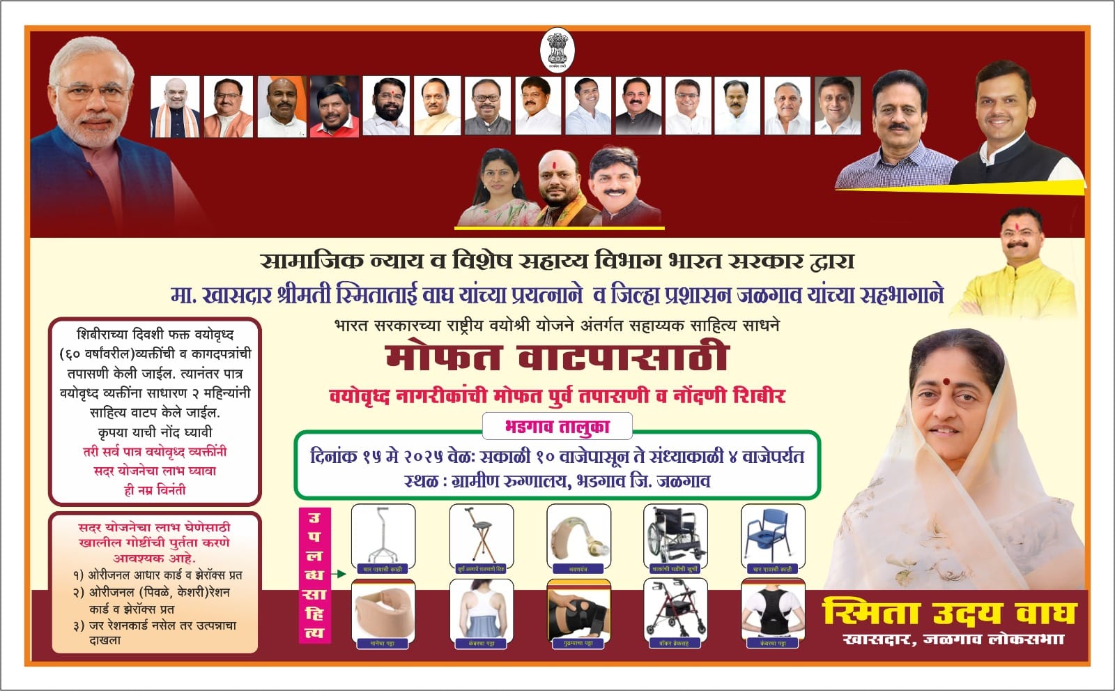 सर्व पदाधिकारी, कार्यकर्ते तसेच समाज सेवक यांना कळवण्यात येते की, केंद्र शासनाच्या राष्ट्रीय वयोश्री योजने अंतर्गत व माननीय खासदार श्रीमती स्मिता ताई वाघ यांच्या प्रयत्नाने जळगाव मतदार संघातील वयोवृद्ध व्यक्तींना सहाय्यक साहित्य उपलब्ध करुन दिले जाणार आहे. सदर शिबिरात व्हील चेअर, कर्णयंत्रे, कमोड चेअर, कमरेचे पट्टे, वॉकर, चष्मे, कृत्रिम दात असे १५ प्रकाराचे साहित्य मोफत वाटप केले जाणार आहे.