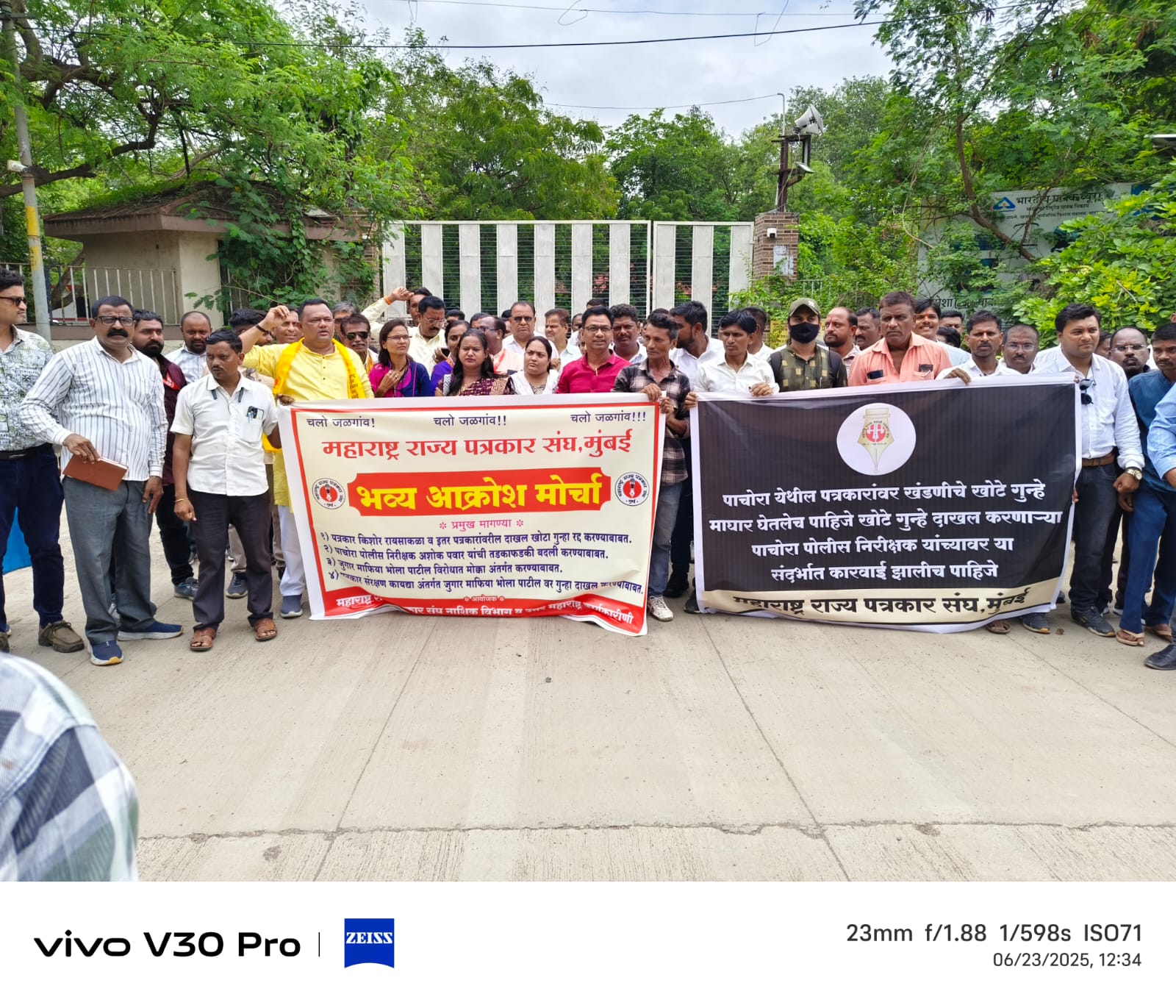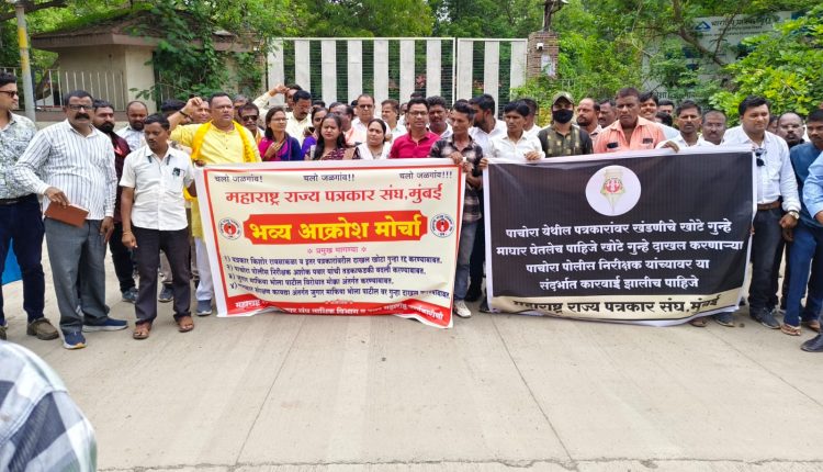 जळगाव जिल्ह्यातील पाचोरा तालुक्यातील महाराष्ट्र राज्य पत्रकार संघाचे प्रदेश उपाध्यक्ष किशोर रायसाकडा, उत्तर महाराष्ट्र अध्यक्ष भुवनेश दुसाने, तसेच संघटनेचे पदाधिकारी असलेले राकेश सुतार, कुंदन बेलदार यांच्यावर खोटा खंडणीचा गुन्हा दाखल करण्यात आला आहे. याचे कारण म्हणजे वरील पदाधिकारी / पत्रकार यांनी पाचोरा तालुक्यातील अवैध धंदे विरोधात बातम्यांचे सत्र सुरू केले होते. या बातम्यां मुळे पाचोरा तालुक्यातील अवैध धंदे बंद पाडण्यास पोलीस प्रशासनाला भाग पाडले. म्हणून अवैध धंद्यांचा आका असलेला भोला उर्फ शेखर पाटील याने आपला धंदा बंद पडल्याच्या रागातून व पाचोरा पोलीस ठाण्याचे पोलीस निरीक्षक अशोक कचरू पवार यांनी आपले हप्ते बंद झाल्याच्या रागातून दोघांनी संगनमत करून श्री किशोर रायसाकडा, उत्तर महाराष्ट्र अध्यक्ष भुवनेश दुसाने, राकेश सुतार व कुंदन बेलदार आदी पत्रकार बांधवावर खोटा गुन्हा दाखल केला आहे. म्हणून महाराष्ट्र राज्य पत्रकार संघ, मुबंई जिल्हा शाखेने या विरोधात जिल्हाधिकारी कार्यालयावर आक्रोश मोर्चा काढून जिल्हाधिकारी आयुष्य प्रसाद यांच्या द्वारे राज्याचे मुख्यमंत्री तथा गृहमंत्री श्री देवेंद्रजी फडणवीस यांना निवेदन देऊन सदर खोटा गुन्हा तात्काळ मागे घ्यावा व पाचोरा पोलीस निरीक्षक अशोक पवार यांना निलंबीत करावे व गुन्हेगारी प्रवृत्ती च्या भोला उर्फ शेखर पाटील याच्या वर मोक्का कायद्या अंतर्गत कारवाई करून हद्दपार करावे व यापुढे चौकशी केल्याशिवाय पत्रकारांवर खंडणी सारखे गुन्हे दाखल करू नये,अन्यथा महाराष्ट्र राज्य पत्रकार संघ राज्य भर रस्त्यावर उतरून उग्र आंदोलन करेल. असे झाल्यास आपल्या सरकारची प्रतिमा मालिन होण्याची दाट शक्यता असल्याने आपण वैयक्तिक लक्ष घालून खोटे गुन्हे त्वरित मागे घ्यावे,अश्या आशयाच्या मागण्या निवेदनात केल्या आहे.
