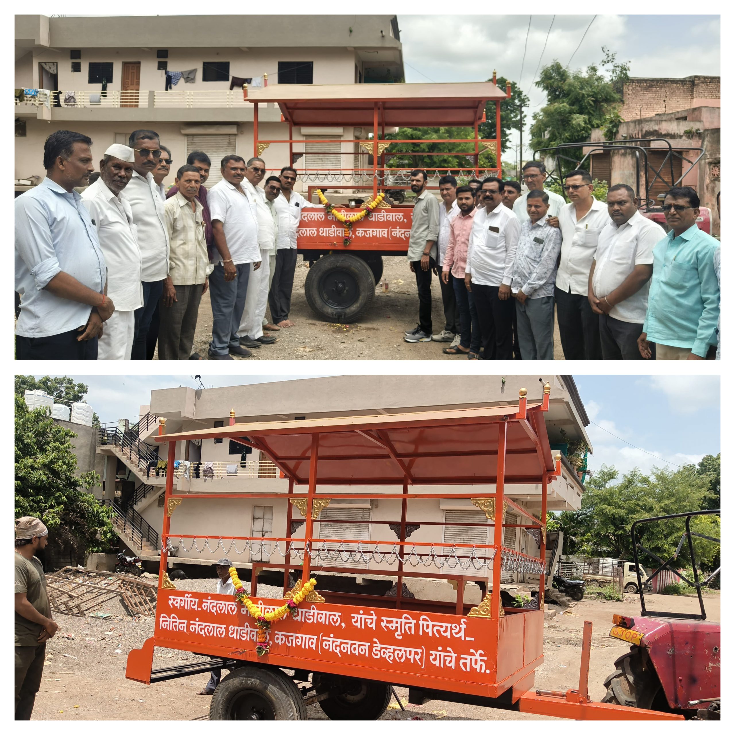 कजगाव (ता. भडगाव) येथील नंदनवन डेव्हलपर्सचे संचालक नितीन नंदलाल धाडीवाल यांच्या वाढदिवसाचे औचित्य साधून, त्यांच्या वडील स्वर्गीय नंदलाल मोतीलाल धाडीवाल यांच्या स्मृतीपित्यर्थ कजगाव परिसरातील नागरिकांच्या सेवेसाठी ‘स्वर्गरथ’ सेवा उपलब्ध करून देण्यात आली. या ‘स्वर्गरथ’ चे लोकार्पण कजगाव गावाचे सरपंच रघुनाथ महाजन यांच्या हस्ते करण्यात आले.