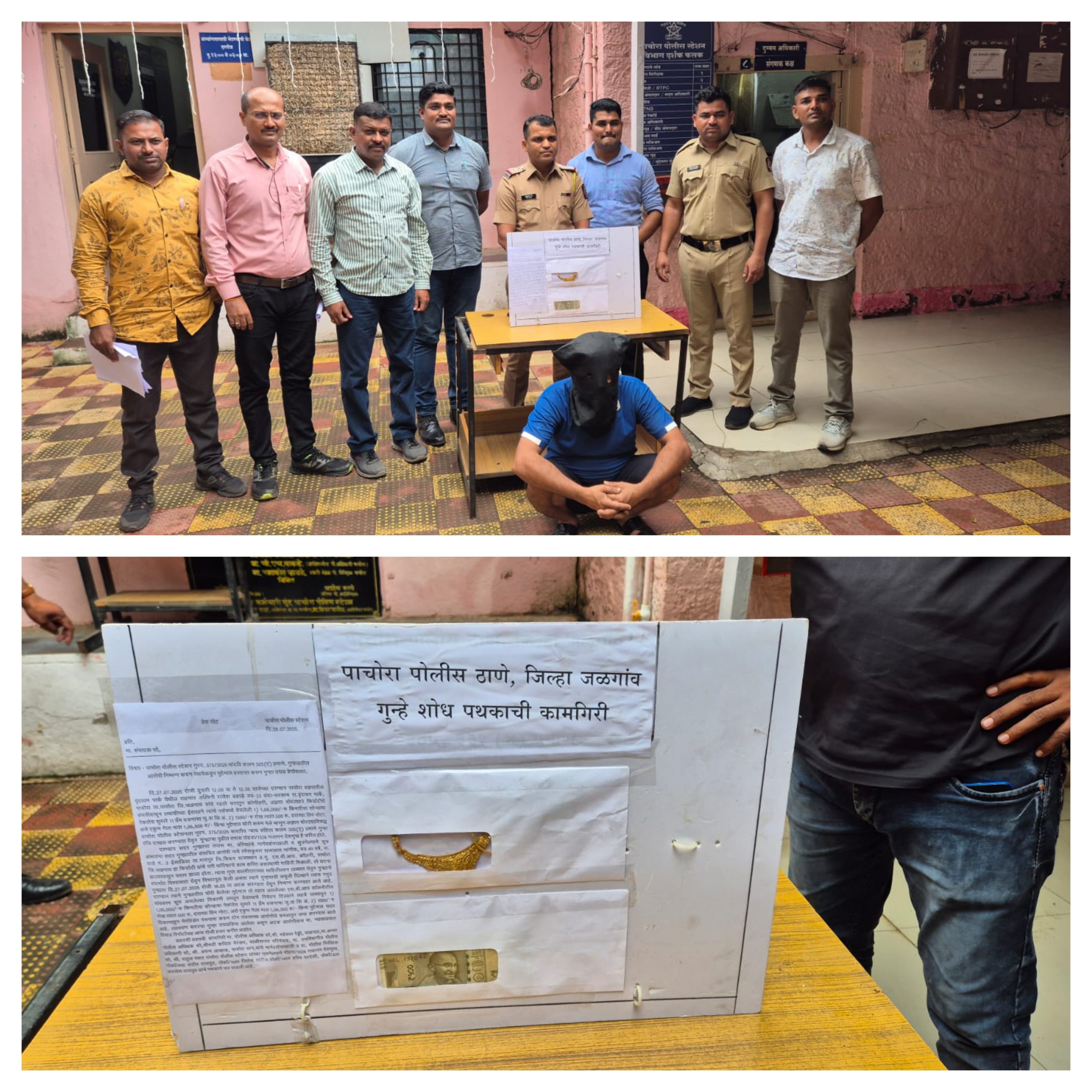 अश्विनी राजेश डहाळे (रा. वृंदावन पार्क, पाचोरा) यांच्या घरातून अज्ञात चोरट्याने ₹1,05,000/- किमतीचा सुमारे 11 ग्रॅम वजनाचा सोन्याचा नेकलेस व ₹1500/- रोख रक्कम चोरी केल्याची तक्रार पाचोरा पोलीस स्टेशनमध्ये दाखल करण्यात आली होती. गुन्ह्याचा तपास पो. ह. गजानन देशमुख हे करत होते.