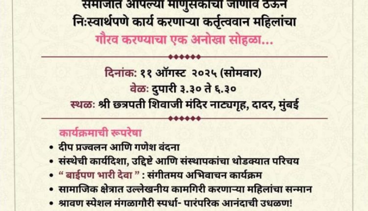 या कार्यक्रमात सामाजिक भान जपत कार्य करणाऱ्या उल्लेखनीय महिलांचा गौरव करण्यात येणार असून, एक प्रेरणादायी सांस्कृतिक पर्व अनुभवण्याची संधी उपस्थितांना मिळणार आहे. कार्यक्रमाची सुरुवात दीपप्रज्वलन आणि गणेश वंदनेने होणार असून, त्यानंतर संस्थेची कार्यदिशा, उद्दिष्टे आणि संस्थापकांचा थोडक्यात परिचय सादर केला जाईल. यानंतर “बाईपण भारी देवा” या संगीतमय आणि भावस्पर्शी अभिवाचनाचा आस्वाद रसिकांना घेता येणार आहे.