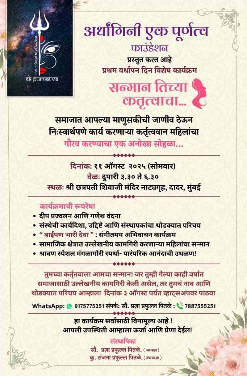 मुंबई (गुरुदत्त वाकदेकर) : सर्वांचे घर असावे, सर्वा मुखी असावा घास, राहू नये कधी कुणी उपाशी हा एकाच वसा हा एकाच ध्यास… समाजात माणुसकीची जाणीव ठेवत, निःस्वार्थ भावनेने कार्य करणाऱ्या कर्तृत्ववान महिलांचा गौरव करण्यासाठी ‘अर्धांगिनी एक पूर्णत्व फाउंडेशन’ तर्फे त्यांच्या प्रथम वर्धापन दिना निमित्त एक आगळावेगळा सन्मान सोहळा आयोजित करण्यात आला आहे. ‘सन्मान तिच्या कर्तृत्वाचा’ या विशेष कार्यक्रमाचे आयोजन ११ ऑगस्ट २०२५, सोमवार रोजी दुपारी ३.३० ते ६.३० या वेळेत श्री छत्रपती शिवाजी मंदिर नाट्यगृह, दादर, मुंबई येथे होणार आहे.