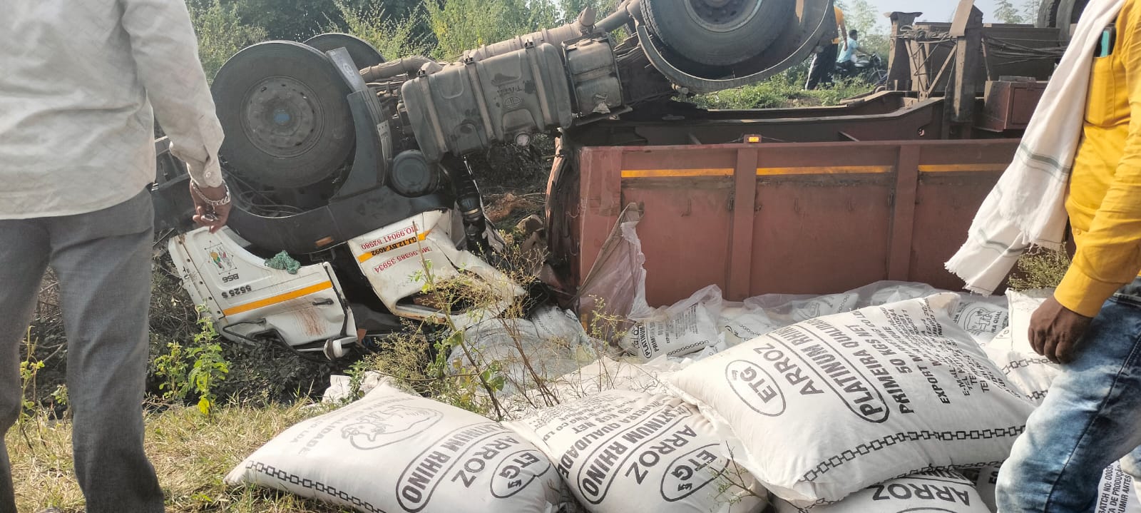 तांदूळाने भरलेला ट्रक रस्त्याबाहेर; सुदैवाने जीवितहानी टळली वडगाव फाट्याजवळ भीषण अपघात.!!!