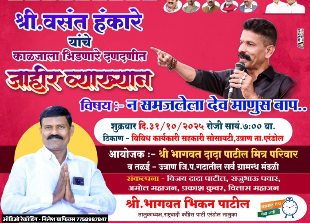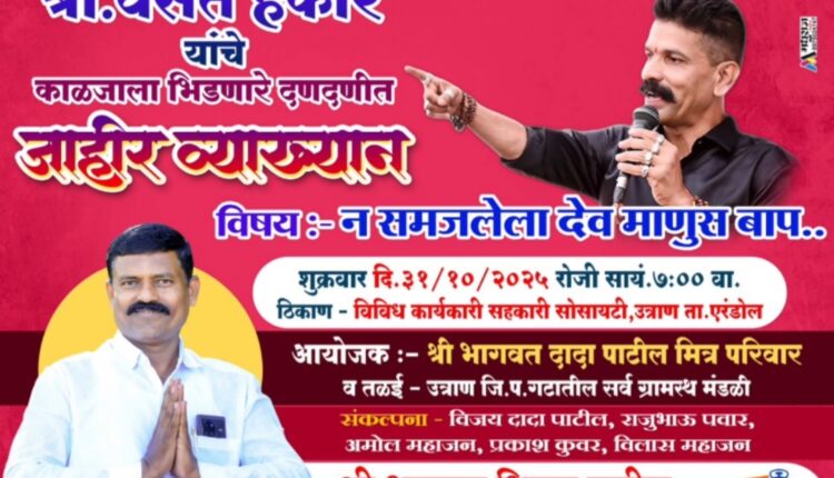 उत्राण (ता. एरंडोल) —मानवतेचा खरा अर्थ, श्रद्धा आणि नातेसंबंधातील बापाच्या स्थानाचे गूढ उलगडणारे “न समजलेला देव माणूस बाप” या विषयावरचे काळजाला भिडणारे दणदणीत जाहीर व्याख्यान सुप्रसिद्ध वक्ते श्री. वसंत हंकारे यांचे आयोजित करण्यात आले आहे.