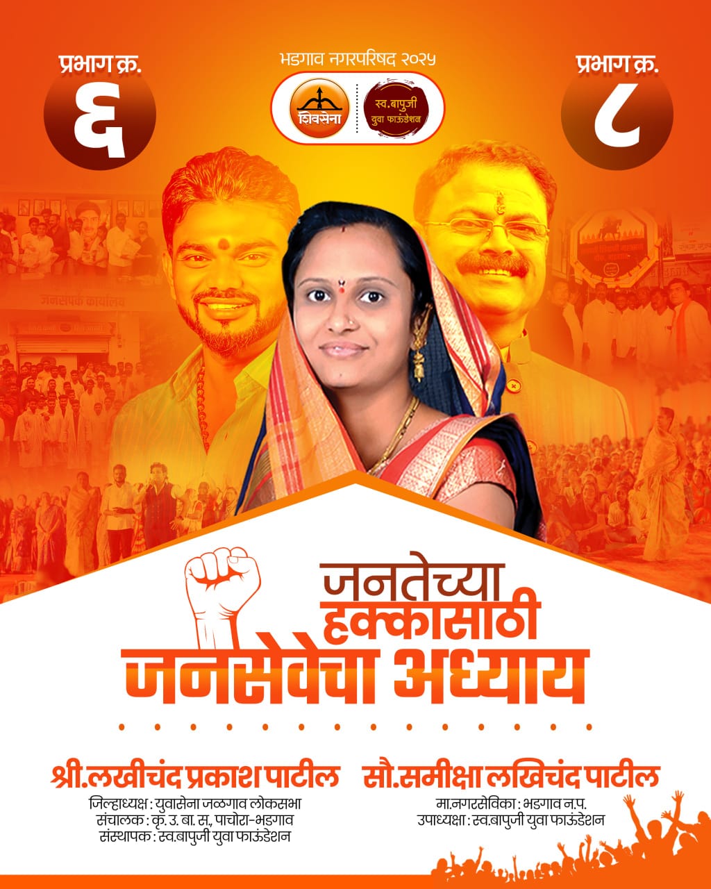 भडगाव नगरपरिषद निवडणुकीची रणधुमाळी सुरू झाली असून, विविध प्रभागांमधून उमेदवारांची चाचपणी, प्रचाराची तयारी वेग घेत आहे. या पार्श्वभूमीवर शिवसेना (शिंदे गट) तर्फे विद्यमान नगरसेविका मा. सौ. समीक्षा लखीचंद पाटील यांनी प्रभाग क्रमांक ८ मधून पुन्हा एकदा निवडणुकीच्या रिंगणात उतरण्याची घोषणा केली आहे.